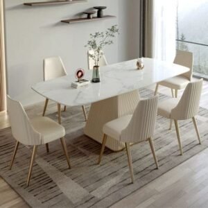 This modern dining table set includes a 71″ rectangular wood table and 6 comfortable fabric chairs, perfect for family meals